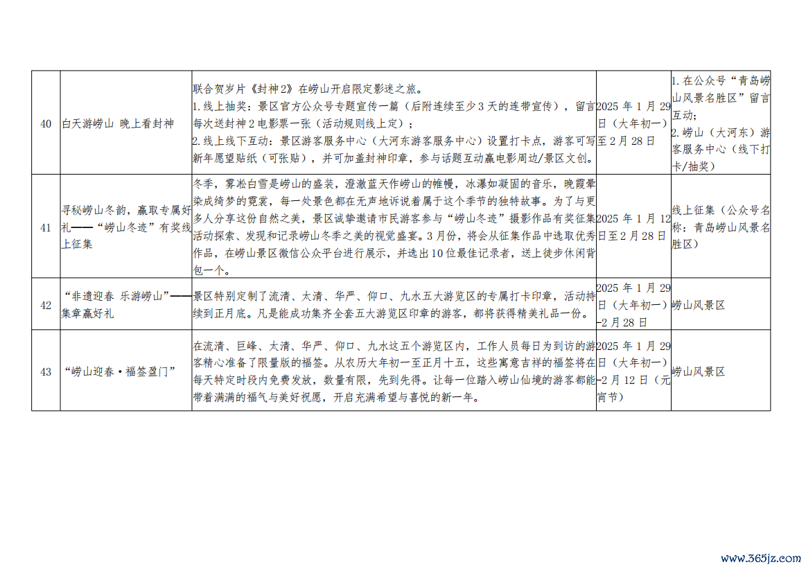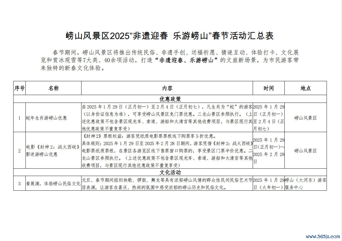 蛇年生肖游崂山优惠。自2025年1月29日(正月月吉)至2月4日(正月初七),凡生肖为“蛇”的旅客(以身份证信息为准),可享受崂山气候区免门票优惠。二龙山景区参照履行。