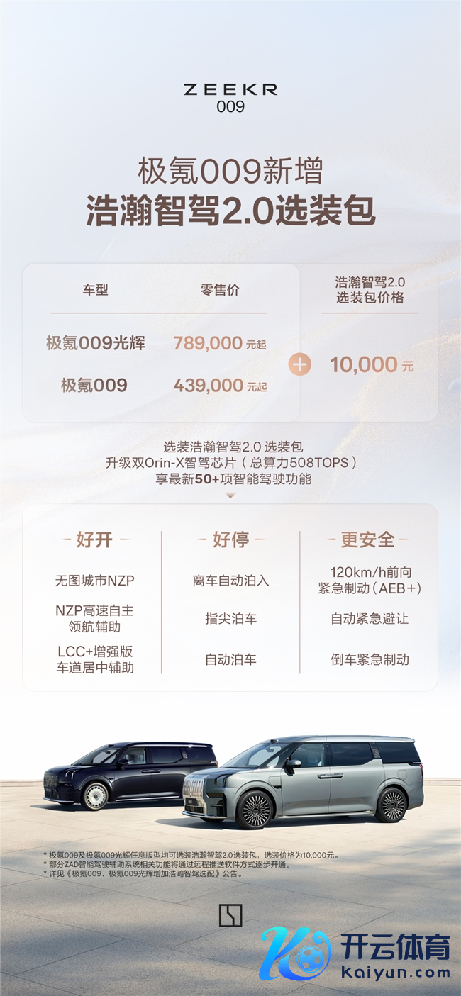 以上的一切,王人发生在极氪009的2024年,用一个“荣光满地”描绘涓滴不外分,而跟着耗尽者需求的多元化,极氪009家眷也在不休优化其居品和事业,以更好地繁荣不同群体的需求。智能化驾驶系统的推出等于其中的进军一步。跟着汽车智能化水平的不休提高,越来越多的耗尽者开动关切智能驾驶系统的设置。为了反应这一趋势,极氪在2025年1月7日晓示,极氪009和极氪009明后将新增重大智驾2.0选装包,售价为10000元。这一选装包的推出,意味着耗尽者将大要享受到愈加智能、浅易的驾驶体验,进一步擢升了极氪009的竞争力。