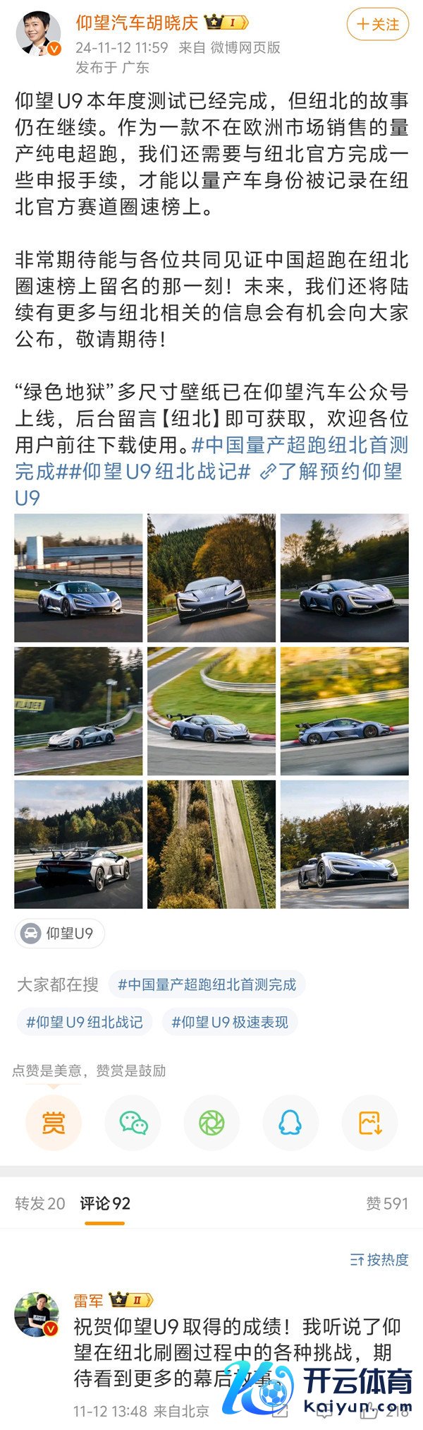 而在这条微博下方,惊现了小米CEO雷军,其留言称:“祝福仰望U9 得到的收获!我传奇了仰望在纽北刷圈进程中的各式挑战,期待看到更多的幕后故事。”