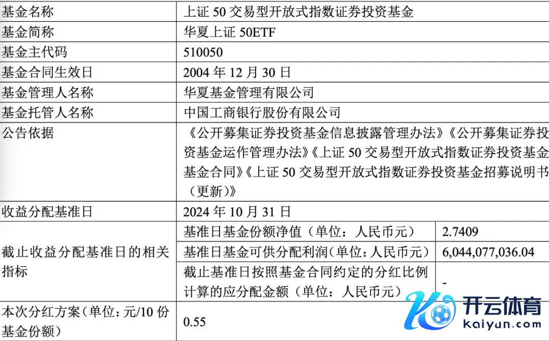 中原上证50ETF以2024年10月31日为基准日进行2024年第一次现款分成,基准日份额净值为2.7409元,可供分派利润为60.44亿元,本次分成决策为0.55元/10份基金份额。