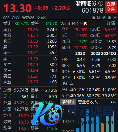 12月4日九游体育娱乐网,浙商证券高开高走,抛弃发稿,该股涨2.7%,报13.3元。