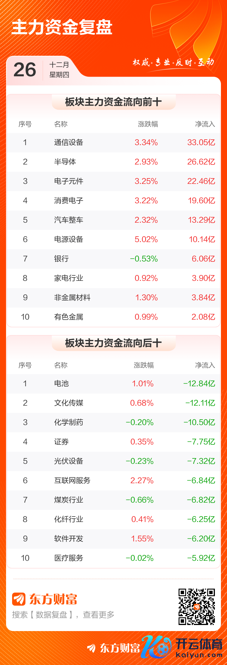 12月26日,沪指涨0.14%,深成指涨0.67%,创业板指涨0.39%。两市成交额1.27万亿,较上个交游日缩量88亿。数据走漏,当天大盘主力资金净流出33.06亿。通讯培育、半导体、电子元件等板块主力资金流入排行居前,其中通讯培育净流入33.05亿元。