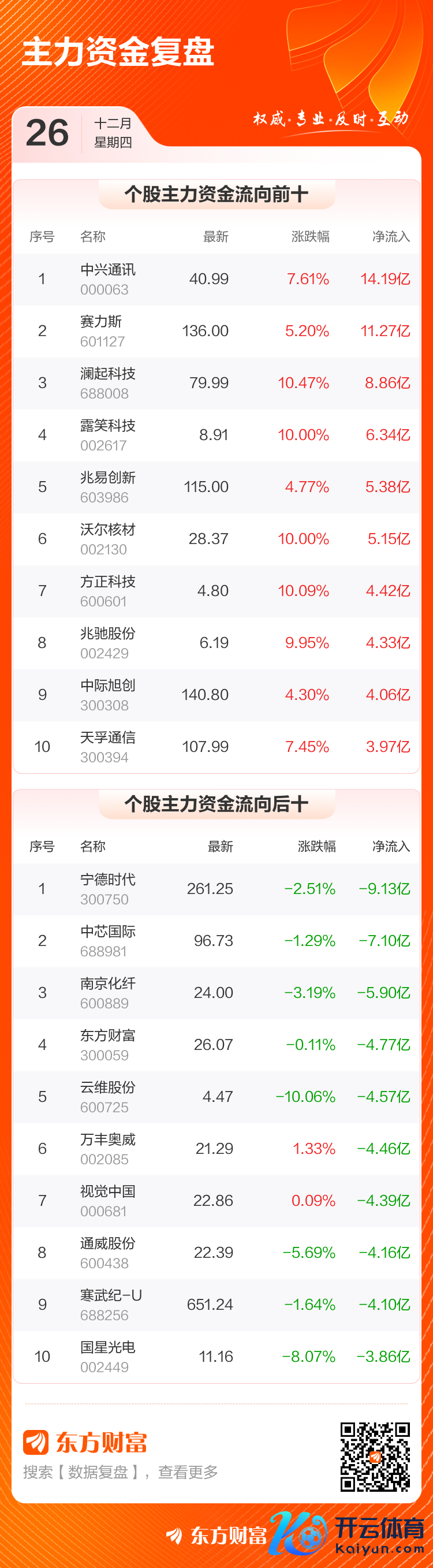 主力净买入个股中,中兴通讯排行第一,主力净买入14.19亿元;赛力斯排行第二,主力净买入11.27亿元。