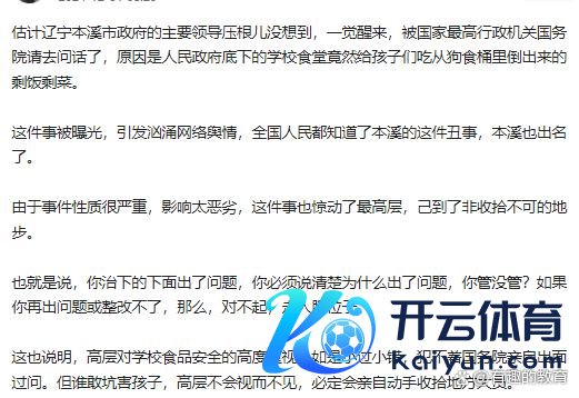 #深度好文接头#推断辽宁本溪市政府的主要引导们作念梦也没意想开yun体育网,一醒悟来,竟被国度最高行政机关请去“喝茶”了。这事儿可不小,原因是他们治下的学校食堂,居然给孩子们吃从狗食桶里倒出来的剩饭剩菜。音问一出,网罗舆情澎湃彭湃,寰宇东谈主民皆知谈了本溪的这件丑事,本溪算是“一举成名”了。