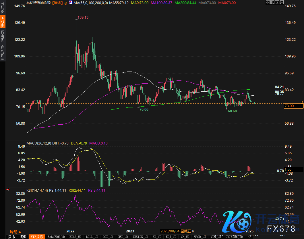 布伦特原油走势与WTI原油高度一致,当今交投于73好意思元隔邻。短期内,布油因循位在70好意思元,若失守则可能回落至65好意思元区域,而上方阻力在80好意思元,冲破后或进一步上探85好意思元。时间缠绵方面,MACD清楚DIFF与DEA粘合,柱状图转负,短期偏空,RSI则处于中性区域,市集枯竭明确标的。