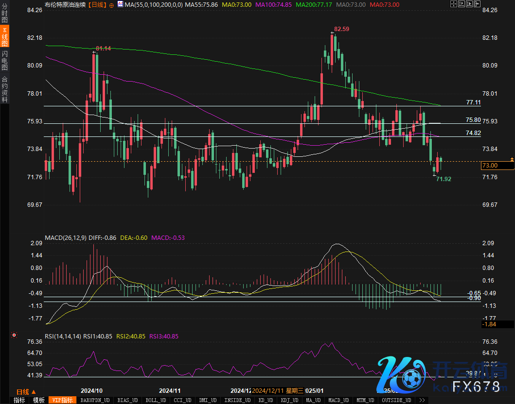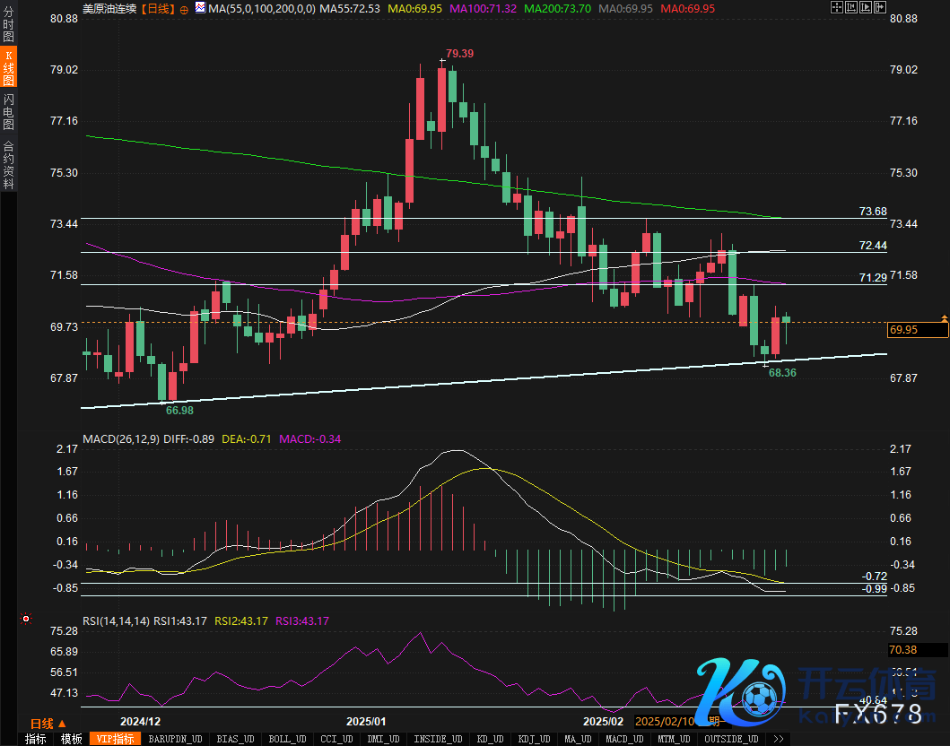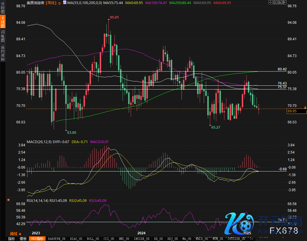 从时间面来看,WTI原油价钱守护在70-80好意思元的轰动区间,短期内靠近一定的下行压力。周线级别上,MA200均线(84.31好意思元)和MA400均线(73.00好意思元)离别组成枢纽压力与因循,若价钱简略冲破MA200,可能迎来更大级别的反弹。MACD缠绵清楚,DIFF与DEA在零轴下方不绝,绿柱镌汰,标明着落动能有所减弱,或存在反弹的可能性。但日线级别清楚,短期均线压制清亮,价钱仍受制于69.95好意思元隔邻,若跌破68.36好意思元的因循位,可能进一步下探65好意思元区域。