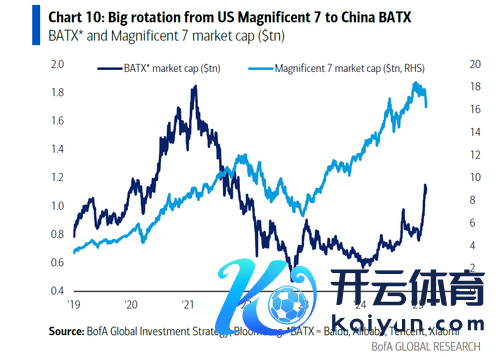 Hartnett以为,好意思国科技股相干于中国科技股而言,估值过高且抓有量过大。他以为,市集将出现从16万亿好意思元市值的好意思国“七巨头”到1万亿好意思元市值的中国BATX(百度、阿里巴巴、腾讯、小米)的大限度轮动。