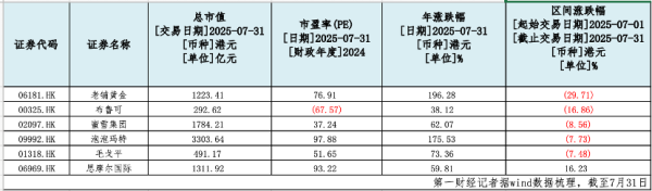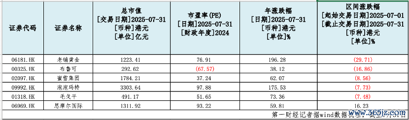 泡泡玛特市值自6月16日的3693亿港元高点缩水至3266亿港元;蜜雪集团市值从6月4日的2336亿港元跌落至1758亿港元,退出“2000亿俱乐部”;老铺黄金市值更从7月8日的1868亿港元骤减至1191亿港元。限制8月1日,三家明星股从高位共计挥发市值超1500亿港元。
