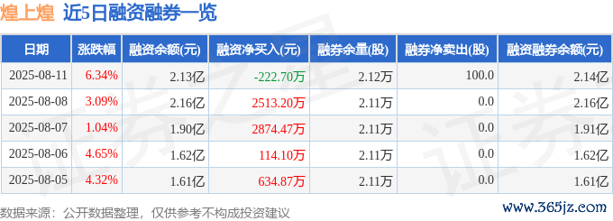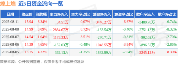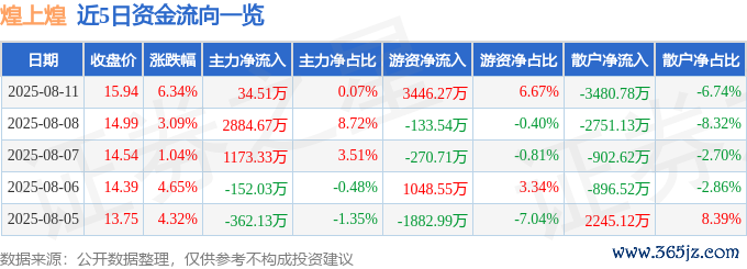 本站音尘,扫尾2025年8月11日收盘,煌上煌(002695)报收于15.94元,上升6.34%,换手率6.46%,成交量33.05万手,成交额5.17亿元。
