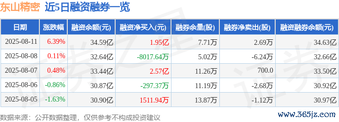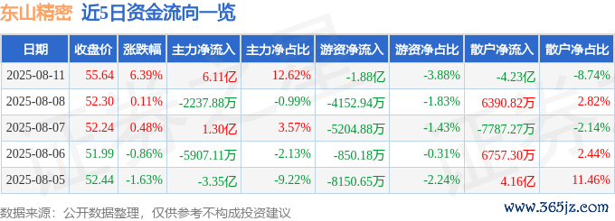 本站音信,阻挡2025年8月11日收盘,东山精密(002384)报收于55.64元,高涨6.39%,换手率6.35%,成交量88.04万手,成交额48.4亿元。