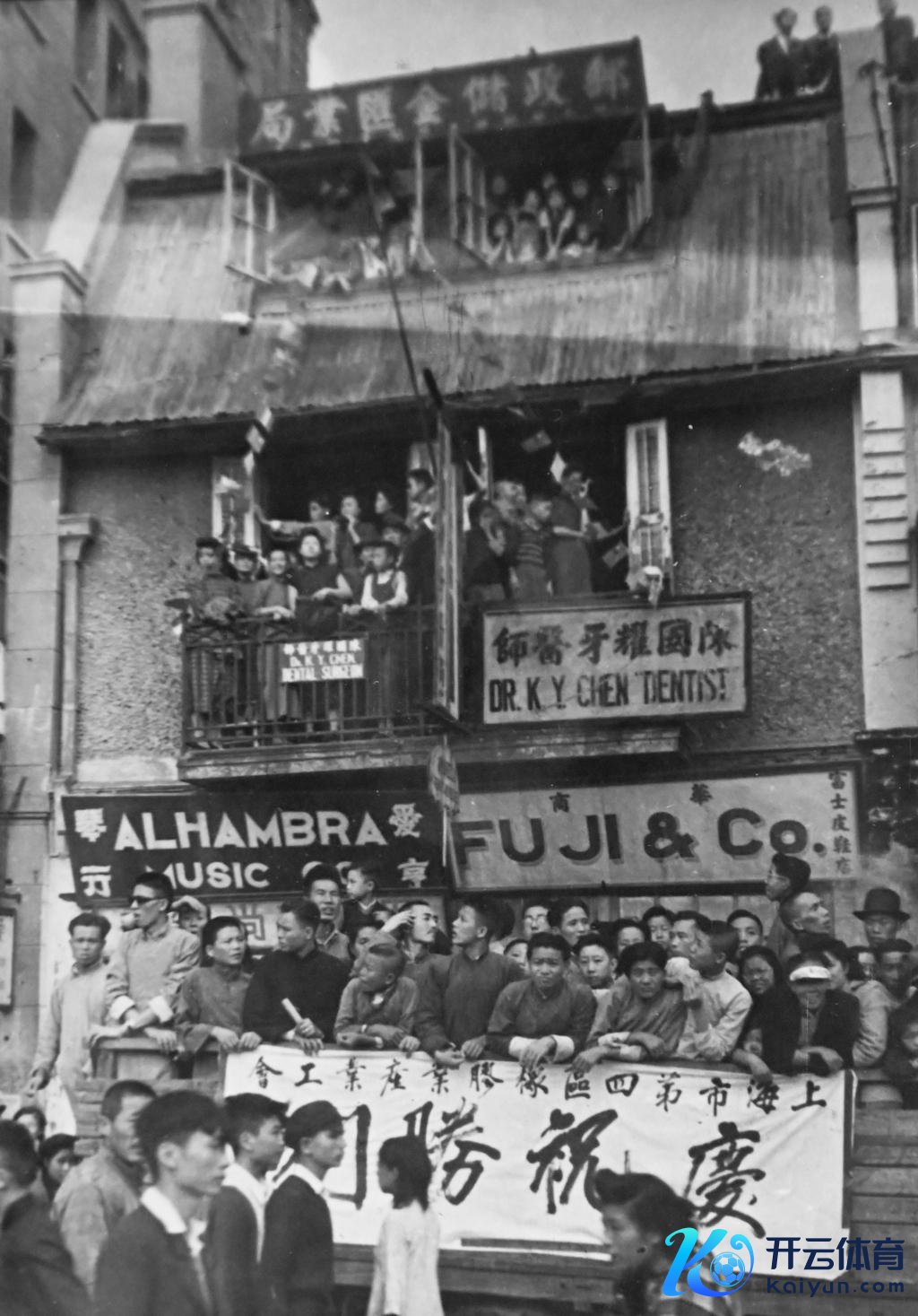 上海。一张相片中,康正平拍下了抗日获胜之后东谈主们庆祝的场景:行走的路东谈主、街边的路东谈主,站定在每个能望到外面寰球阳台上的东谈主,横幅上拉着“庆祝获胜”的字样,约1945年。康正平 摄,图片源头:虹口区档案馆