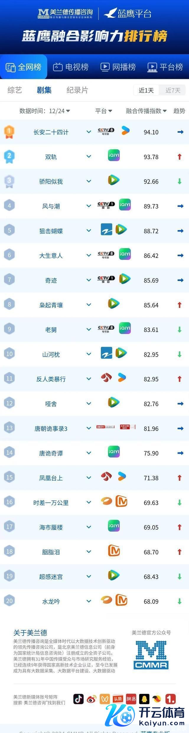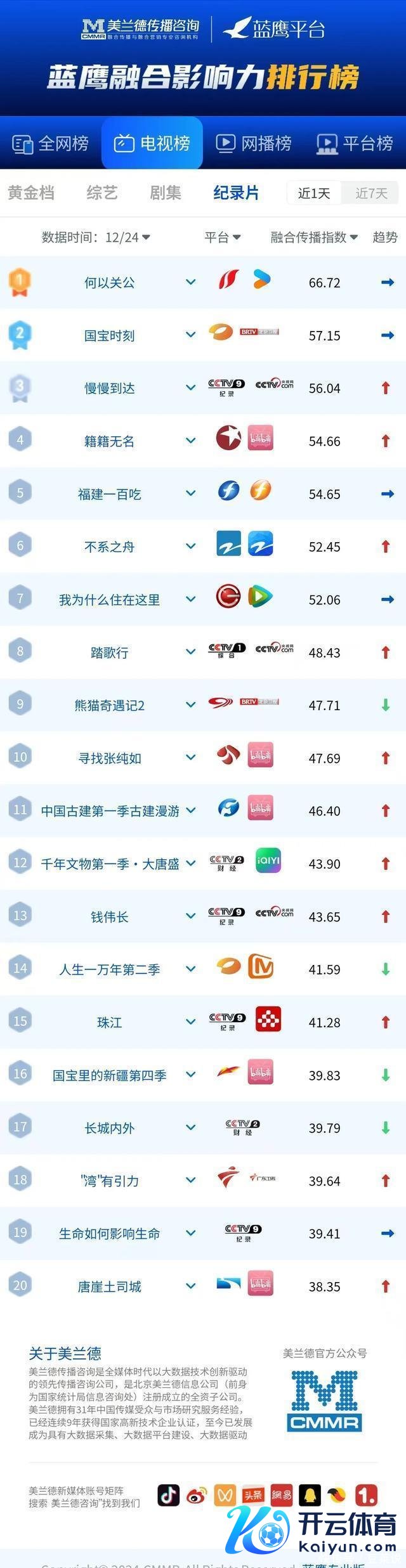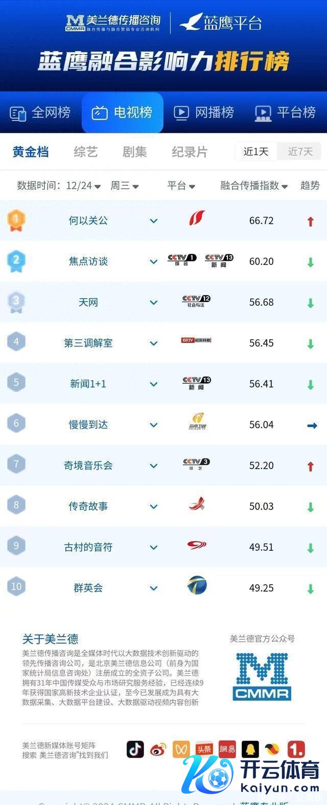 逐日亮点骨子推介 山西卫视《缘何关公》 正在热播,本片横跨多国拍继承材,以丰富史料与影像全面解读关公行为文化象征的全球影响力,深度阐释中中文化“忠义仁勇”的精神内核,真切主题与立异抒发捏续诱导网媒、网媒关注点赞。节目昨日位列热播电视记录片、晚间黄金档电视节目交融传播指数榜双榜第一。 海南卫视《逐渐到达》 正在热播,节目紧扣海南自贸港封关热门,将传统表象纪实与千里浸式东说念主物叙事相荟萃,通过嘉宾在海南环岛旅游公路上的真正体验九游体育app官网,全景展现海南的生态之好意思、多元文化和时期活力,协调作风备受赞叹。节目昨日好意思誉度100,位列晚间黄金档电视节目交融传播指数榜第六。 江西卫视《外传故事》 昨日更新九游体育app官网,本期聚焦以老东说念主扶为切口聚焦遗产哄骗事件,以“故事化”叙事,再行演绎真正新闻事件,深入挖掘其中的伦理说念德和东说念主文温顺备受赞叹,层层设悬的叙事作风捏续诱导网友追看热议。节目昨日位列晚间黄金档电视节目交融传播指数榜第八。 好意思兰德蓝鹰指数 晚间黄金档电视节目交融传播指数(12月24日)