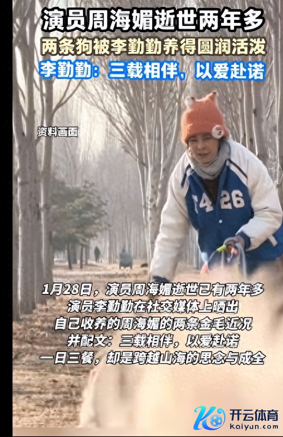 2026年1月28日,演员周海媚死灭已有两年多,今日,演员李勤勤在我方的酬酢媒体账号上,晒出了两条金毛犬的现状,这两条狗狗恰是周海媚生前的爱犬。李勤勤还专门配文:“三载相伴,以爱赴诺,一日三餐,却是跳跃山海的念念念与周详”九游体育娱乐网,用简便而真诚的语言,诉说着对友东说念主的念念念和对这份委托的信守。